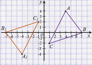 Значит, точкам А(4; 4), В(7; 0), С(1; -2) относительно начала координат симметричны точки А1(-4; -4), В1(-7; 0), С1(-1; 2), тогда треугольнику АВС относительно начала координата симметричен треугольник А1В1С1.