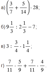 В пунктах а) и г) для упрощения вычислений применяем распределительное свойство умножения. В пункте а) раскрываем скобки, умножая каждый компонент на множитель, стоящий за скобками, и затем складываем полученные произведения, а в пункте г), наоборот, выносим общий множитель за скобки, выполняем вычисления в скобках и умножаем полученный результат на вынесенный множитель.