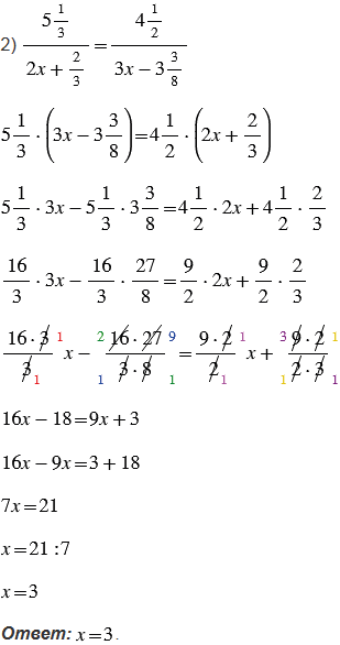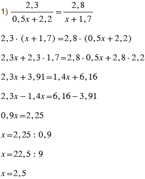 , используем основное свойство пропорции: произведение крайних членов пропорции равно произведению ее средних членов. Затем в каждом уравнении раскрываем скобки. Чтобы раскрыть скобки, нужно множитель, стоящий за скобками, умножить на каждое слагаемое, стоящее в скобках (учитываем то, что вычитание можно заменить сложением с противоположным числом). Далее при решении полученных уравнений учитываем то, что если перенести слагаемое из одной части уравнения в другую с противоположным знаком, то полученное уравнение имеет те же корни, что и данное. После в левой части уравнений приводим подобные слагаемые, а в правой - выполняем вычисления. Слагаемые, имеющие одинаковую буквенную часть, называют подобными слагаемыми. Чтобы сложить подобные слагаемые, надо сложить их коэффициенты (числа, стоящие перед буквенной частью) и полученный результат умножить на общую буквенную часть. И затем находим неизвестный множитель. Чтобы найти неизвестный множитель, нужно произведение разделить на известный множитель.