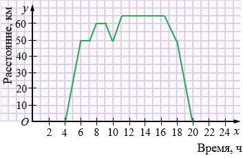 В 4 ч утра группа туристов отправилась в поход. Сначала они ехали на автобусе 2 ч и проехали 50 км. Затем они вышли на остановке и на час сделали привал. Далее на моторных лодках против течения реки они отправились ловить рыбу и за час проплыли 10 км. Опустив якоря туристы час ловили рыбу на одном месте, а затем убрали якоря и течение отнесло их за 1 час обратно к месту посадки на лодки. Туристы снова завели мотор и проплыли по реке против течения 15 км за 1 час и выгрузились на берег, чтобы пообедать и посидеть на берегу у костра. В 16 ч 30 мин туристы снова погрузились в лодки и вернулись на автобусную остановку к 18 ч, сели в автобус и вернулись обратно в город к 20 ч.