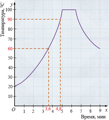 г) через сколько времени после включения температура воды в чайнике была 60 0С; 90 0С?
