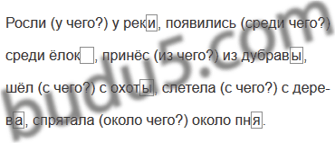 Росли (у чего?) у реки, появились (среди чего?) среди ёлок , принёс (из чего?) из дубравы, шёл (с чего?) с охоты, слетела (с чего?) с дерева, спрятала (около чего?) около пня.