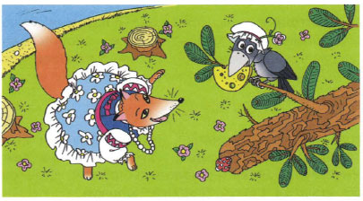 Ворона сидит на ветке. Она держит кусок сыра в клюве. Под деревом к ней крадётся лиса.