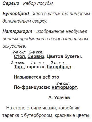 Объясним значения выделенных слов. Сервиз - полный набор столовой или чайной посуды на определённое количество человек. Бутерброд - ломтик хлеба с маслом, с сыром, колбасой и т. п. Натюрморт - картина с изображением цветов, фруктов, битой дичи, рыбы и т. п.