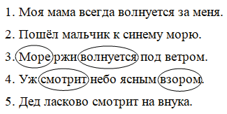 1. Моя мама всегда волнуется за меня. 2. Пошёл мальчик к синему морю. 3. Море ржи волнуется под ветром. 4. Уж смотрит небо ясным взором. (И. Бунин) 5. Дед ласково смотрит на внука.