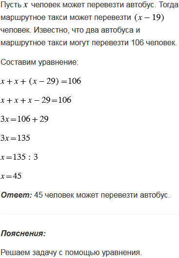Два автобуса и маршрутное такси могут перевезти 106 человек. Маршрутное такси может перевезти на 29 человек меньше, чем автобус. Сколько человек может перевезти автобус?