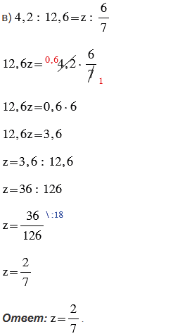 Уравнения из пунктов в) и г) представляют собой пропорции, поэтому при их решении используем основное свойство пропорции, согласно которому произведение крайних членов пропорции равно произведению ее средних членов. Затем, выполнив вычисления в правой части уравнения, находим неизвестный множитель.
