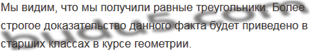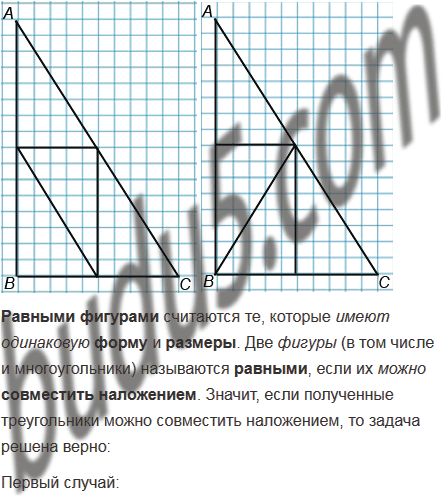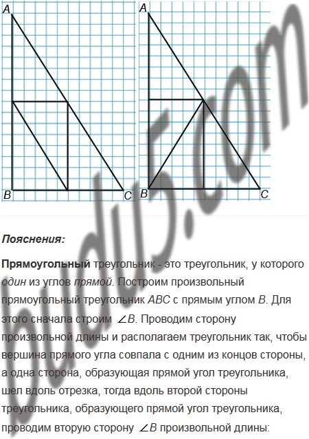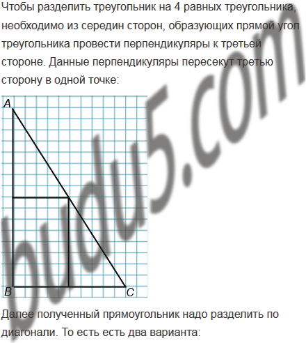 Начертите прямоугольный треугольник и разделите его на четыре равных треугольника.