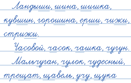 лан-ды-ши, ши-на, шиш-ка, кув-шин, го-ро-ши-на, ер-ши, чи-жи, стри-жи