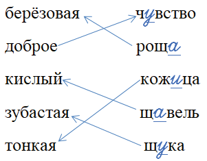 Вставим пропущенные буквы в сочетания ЧУ-ЩУ, ЧА-ЩА, ЖИ-ШИ: чувство, роща, кожица, щавель, щука.