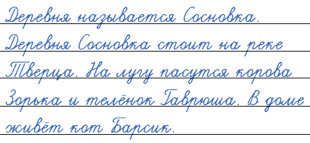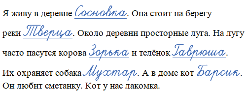 Я живу в деревне ___. Она стоит на берегу реки ___. Около деревни просторные луга. На лугу часто пасутся корова ___ и телёнок ___. Их охраняет собака ___. А в доме кот ___. Он любит сметанку. Кот у нас лакомка.