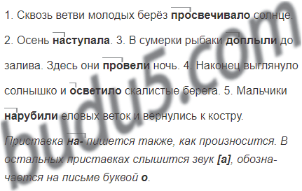 1. Сквозь ветви молодых берёз просвечивало солнце. 2. Осень наступала. 3. В сумерки рыбаки доплыли до залива. Здесь они провели ночь. 4. Наконец выглянуло солнышко и осветило скалистые берега. 5. Мальчики нарубили еловых веток и вернулись к костру.