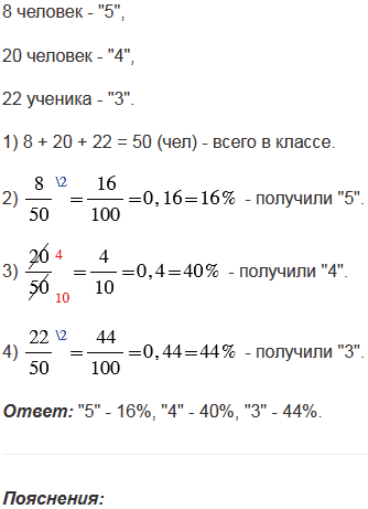 За экзаменационную работу в девятых классах 8 человек получили оценку "5", 20 человек - "4", а остальные 22 ученика - "3". Сколько процентов всех учащихся получили оценку "5", сколько - "4" и сколько "3"?