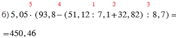 б) 5,05•(93,8 - (51,12 : 7,1 + 32,82) : 8,7).