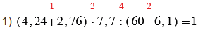 1) (4,24 + 2,76) • 7,7 : (60 - 6,1);
