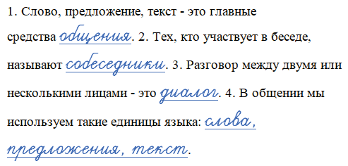 1. Слово, предложение, текст - это главные средства ________ . 2. Тех, кто участвует в беседе, называют ___________. 3. Разговор между двумя или несколькими лицами - это ________. 4. В общении мы используем такие единицы языка: ____________.
