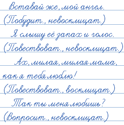 Вставай же, мой ангел. (побуд., невоскл.) Ах, милая, милая мама, как я тебя люблю! (повеств., воскл.) Она нежно целует меня. (повеств., невоскл.) Так ты меня любишь? (вопрос., невоскл.)