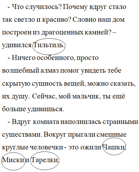Прочитайте строки из сказки М. Метерлинка. Обведите имена собственные. Почему слова Чашки, Миски и Тарелки в тексте написаны с прописной буквы?