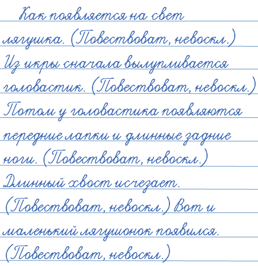 Как появляется на свет лягушка? (вопрос., невоскл.) Из икры сначала вылупливается головастик. (повеств., невоскл.) Потом у головастика появляются передние лапки и длинные задние ноги. (повеств., невоскл.) Длинный хвост исчезает. (повеств., невоскл.) Вот и маленький лягушонок появился! (повеств., воскл.)