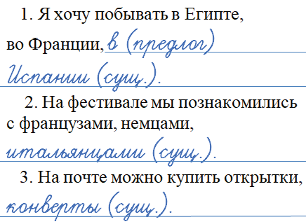 1. Я хочу побывать в Египте, во Франции, ... . 2. На фестивале мы познакомились с французами, немцами, ... . 3. На почте можно купить открытки, ... .