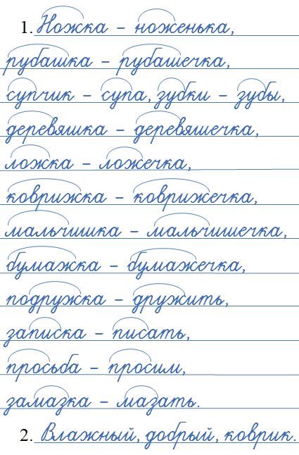 1. Ножка - ноженька, рубашка - рубашечка, супчик - супы, зубки - зубы, деревяшка - деревяшечка, ложка - ложечка, коврижка - коврижечка, мальчишка - мальчишечка, бумажка - бумажечка, подружка - подруженька, записка - записать, просьба - просить, замазка - замазать.