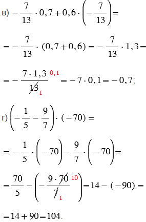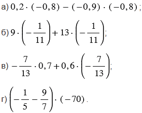 При выполнении вычислений используем распределительное свойство умножения, т.е. в пунктах а), б) и в) выносим одинаковые множители за скобки, затем выполняем вычисления в скобках и умножаем полученный результат на вынесенный множитель, а в пункте г), наоборот, раскрываем скобки умножая каждый из компонентов, стоящих в скобках, на множитель, стоящий за скобками, затем складываем полученные произведения.