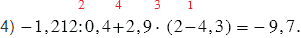 4) -1,212 : 0,4 + 2,9 • (2 - 4,3).