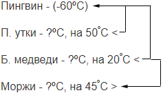 Королевский пингвин способен выдержать температуру до -60ºС. Самым морозоустойчивым животным в мире является полярная утка, которая может выдержать температуру на 50ºС ниже. Белые медведи выдерживают температуру на 20ºС ниже, а моржи - выше этой температуры на 45 ºС. Какие температуры выдерживают белые медведи, моржи и полярные утки