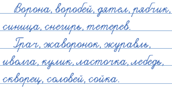 Грач, жаворонок, журавль, иволга, кулик, ласточка, лебедь, скворец, соловей; ворона, воробей, дятел, рябчик, синица, снегирь, сойка, тетерев.