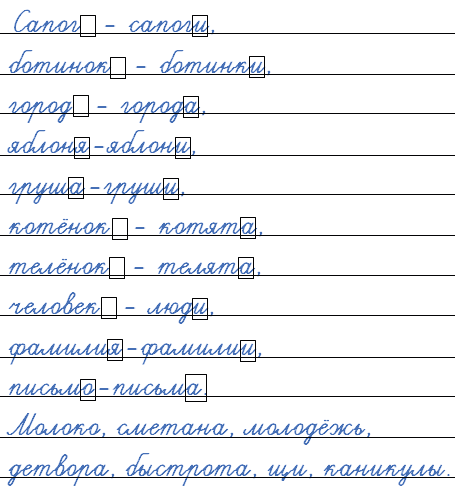 Сапог, ботинок, город, яблоня, груша, молоко, сметана, котёнок, телёнок, человек, молодёжь, детвора, фамилия, письмо, быстрота, щи, каникулы.