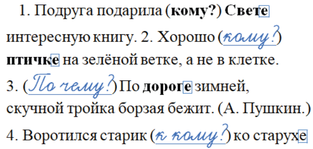 1. Подруга подарила (кому?) Свете интересную книгу. 2. Хорошо (___) птичке на зелёной ветке, а не в клетке. 3. (___) По дороге зимней, скучной тройка борзая бежит. (А. Пушкин.) 4. Воротился старик (___) ко старухе (А. Пушкин.)