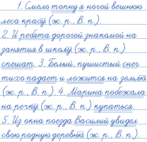 1. Смело топну я ногой вешнюю леса красу (ж. р., В. п.). (А. Майков.) 2. И ребята дорогой знакомой на занятия в школу (ж. р., В. п.) спешат. (М. Исаковский.) 3. Белый, пушистый снег тихо падает и ложится на землю (ж. р., В. п.). (пред-е с одн. чл.) 4. Марина побежала на речку (ж. р., В. п.) купаться. 5. Из окна поезда Василий увидел свою родную деревню (ж. р., В. п.).