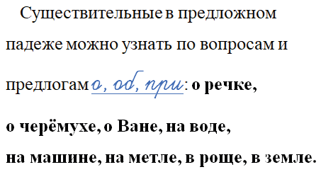 Существительные в предложном падеже можно узнать по вопросам и предлогам _______: о речке, о черёмухе, о Ване, на воде, на машине, на метле, в роще, в земле.