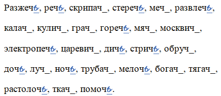 Разжеч_, реч_, скрипач_, стереч_, меч_, развлеч_, калач_, кулич_, грач_, гореч_, мяч_, москвич_, электропеч_, царевич_, дич_, стрич_, обруч_, доч_, луч_, ноч_, трубач_, мелоч_, богач_, тягач_, растолоч_, ткач_, помоч_.