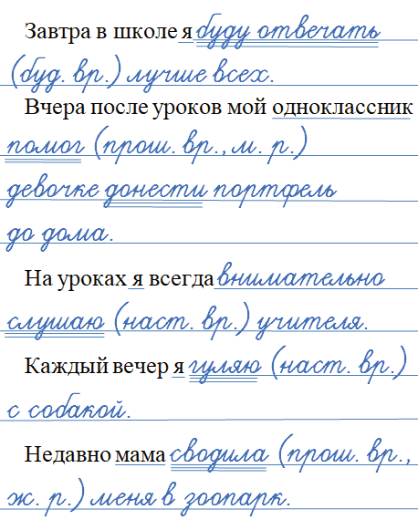 Укажите время и, если можно, род глаголов. Подчеркните главные члены в каждом предложении.