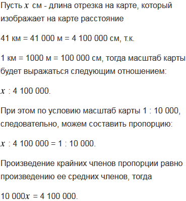Масштаб карты равен 1 : 10 000. Чему равна длина отрезка на карте, изображающего расстояние 41 км?