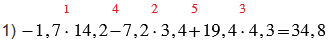 1) -1,7 • 14,2 - 7,2 • 3,4 + 19,4 • 4,3;