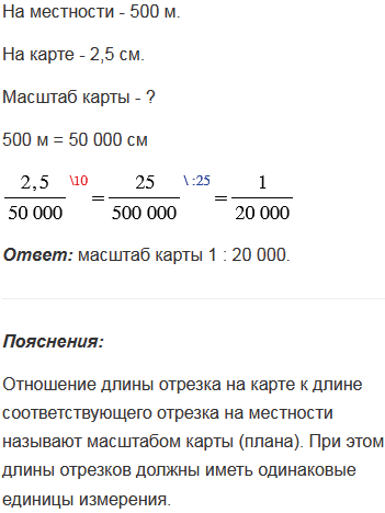 Расстояние между двумя пунктами на местности 500 м, а на карте - 2,5 см. Найти масштаб карты.