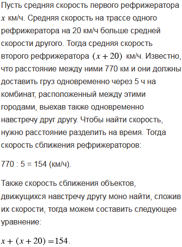 Два рефрижератора из двух городов, расстояние между которыми 770 км, должны доставить груз одновременно через 5 ч на комбинат, выехав также одновременно навстречу друг другу. Средняя скорость на трассе одного рефрижератора на 20 км/ч больше средней скорости другого. С какой средней скоростью они должны двигаться, чтобы прибыть в пункт назначения?