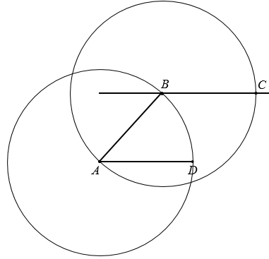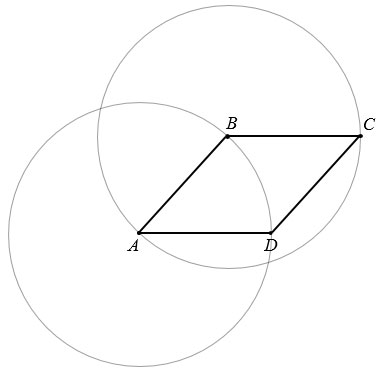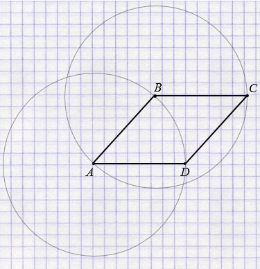 Учитывая то, что нам нужно построить параллелограмм, у которого все стороны равны, чертим с помощью циркуля окружность радиуса АD с центром в точке А, точку пересечения этой окружности с прямой параллельной АD обозначаем буквой В и соединяем точки А и В.
