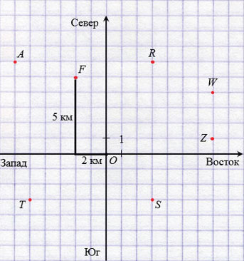 Назовите координаты точки, в которую попадешь, если будешь идти на запад 2 км, а потом на север 5 км (рис. 72). Составьте маршруты движения из точки О в точки А, R, Т, S, Z, W. Назовите их координаты.