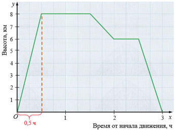 г) Самолет поднимался 0,5 ч с 0 до высоты 8 км, то есть он пролетел 8 км, значит, скорость, с которой самолет поднимался равна: