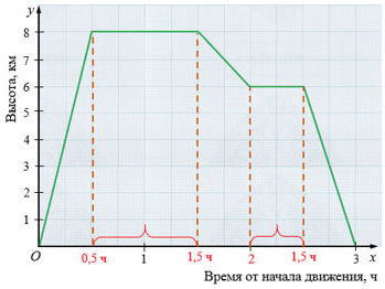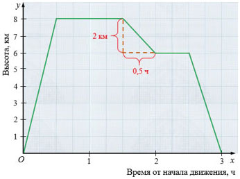 д) Самолет снижался 0,5 ч с высоты 8 км до высоты 6 км, то есть он пролетел 2 км, значит, скорость, с которой самолет снижался до высоты 6 км, равна: