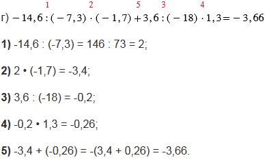 г) -14,6 : (-7,3) • (-1,7) + 3,6 : (-18) • 1,3.