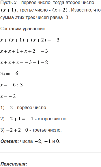 Найдите три последовательных целых числа, если их сумма равна -3.