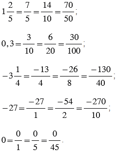 Чтобы записать числа несколькими способами используем основное свойство дроби, согласно которому при умножении числителя и знаменателя дроби на одно и то же число, отличное от нуля, получается дробь, равная данной.