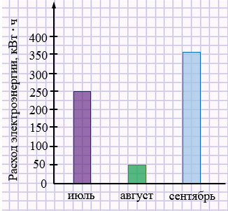 В июле семья Иванушкиных израсходовала 250 кВт • ч, а в следующем месяце они уехали отдыхать, поэтому расход электроэнергии в августе уменьшился на 80%. В сентябре семья вернулась, но в связи с наступлением холодной погоды пришлось начать включать обогреватель, что увеличило расход электроэнергии на 620% по сравнению с августом. Постройте столбчатую диаграмму расхода электроэнергии семьей Иванушкиных.
