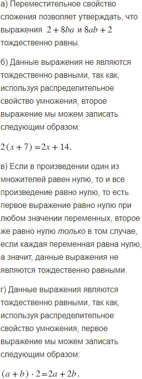 Два выражения, значения которых равны при любых значениях переменных, называются тождественно равными.