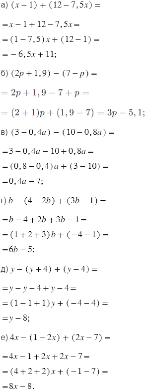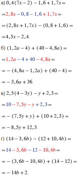 После раскрытия скобок в каждом выражении приводим подобные слагаемые. Подобные слагаемые - это слагаемые, которые имеют одинаковую буквенную часть, т.е. подобные слагаемые могут отличаться только коэффициентами. Чтобы сложить (или привести) подобные слагаемые, надо сложить их коэффициенты и полученный результат умножить на общую буквенную часть (в выражениях подобные слагаемые выделены одинаковым цветом).