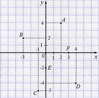 На координатной плоскости (рис. 6) отмечены точки А, В, С, D, Е и F. Найдите их координаты.
